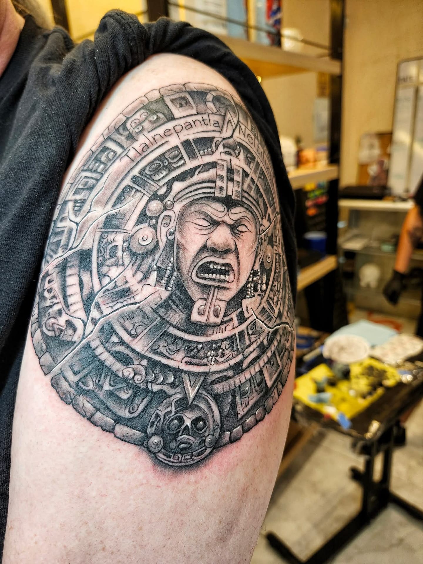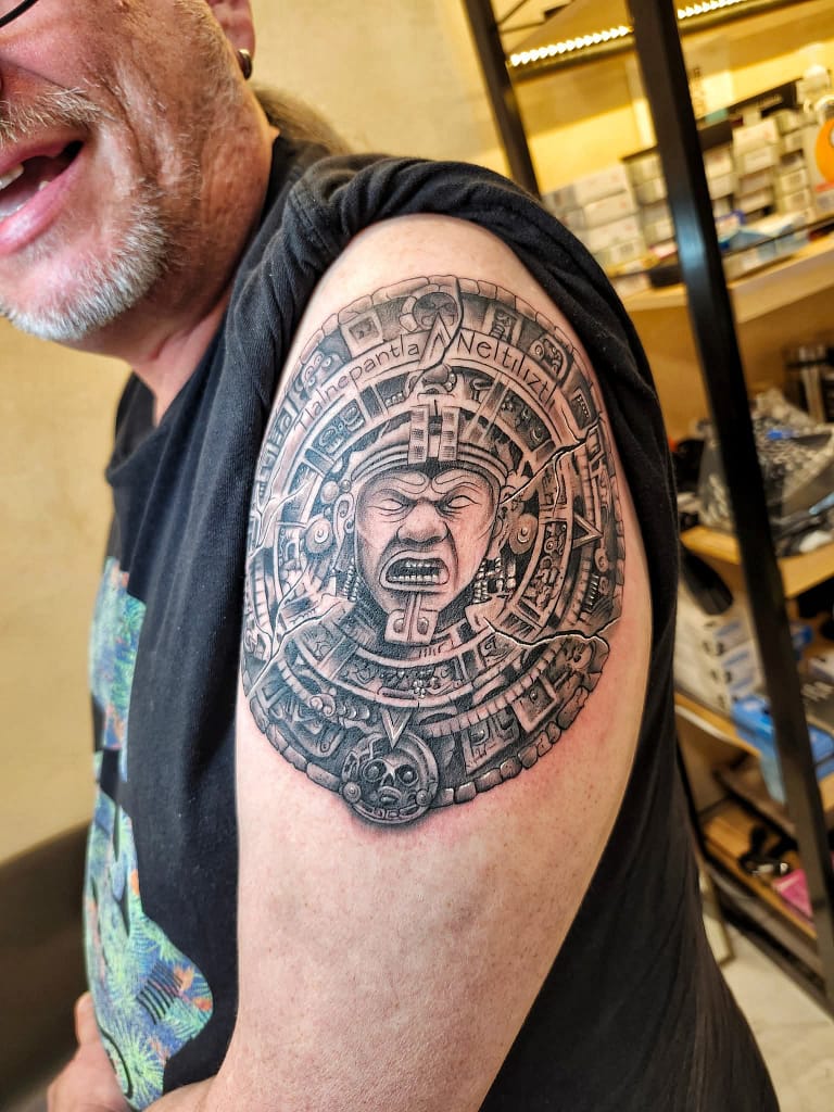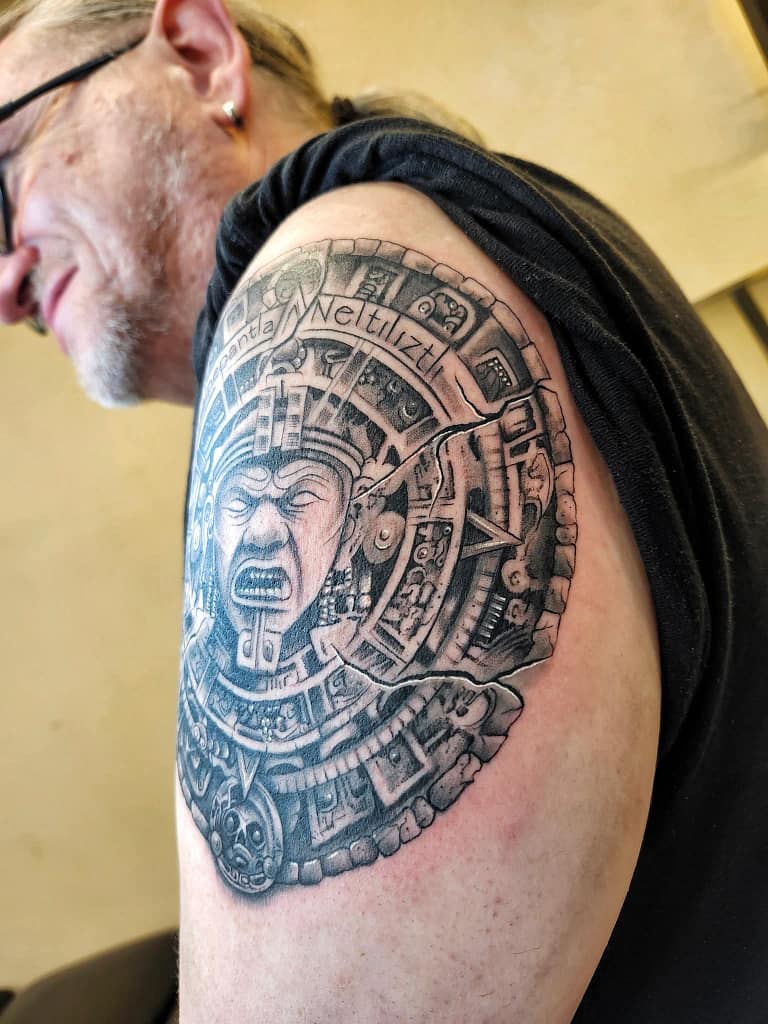 One of the the cultures that has always fascinated and interested me were the Aztecs. When I was very young I learned about the Aztec culture and over the years I’ve added to that knowledge. The philosphy of the Aztecs and how they viewed the world has similarities to several cultures around the globe and also align with my view of life. The tattoo i decided to get is a conceptual piece of art based on the Aztec sun calendar with Tonatiuh at the center who was considered the fifth sun.